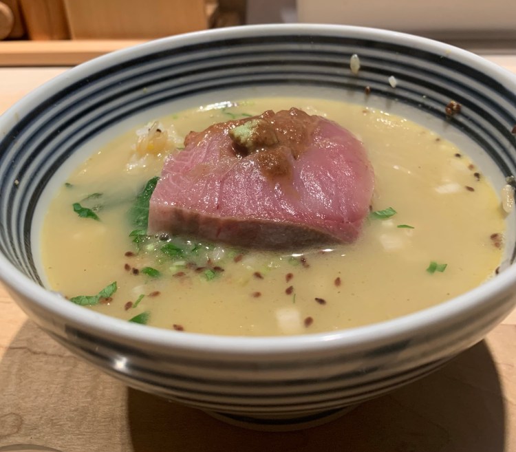 鯛汁の色が素晴らしい!白濁した鯛汁は、濃厚な鯛の旨味が濃縮された色!