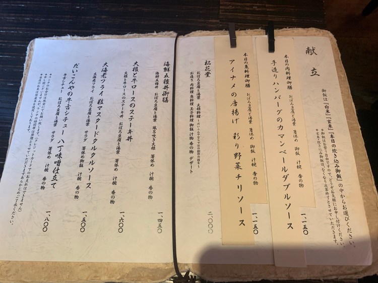 各メニューに、「ごはん」「おぼろ豆腐と海藻」「箸休め」「汁椀」「香の物」がついていて、この価格帯!かなりコスパいいです!