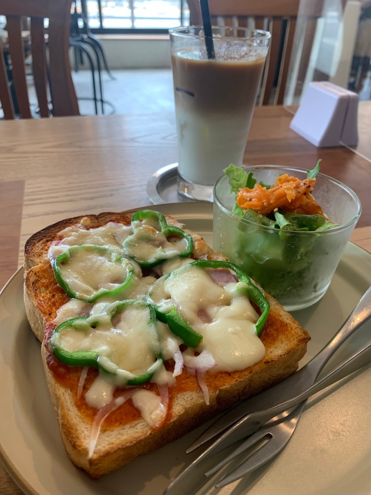 「ピザトースト」と「サラダ」に「カフェラテ」