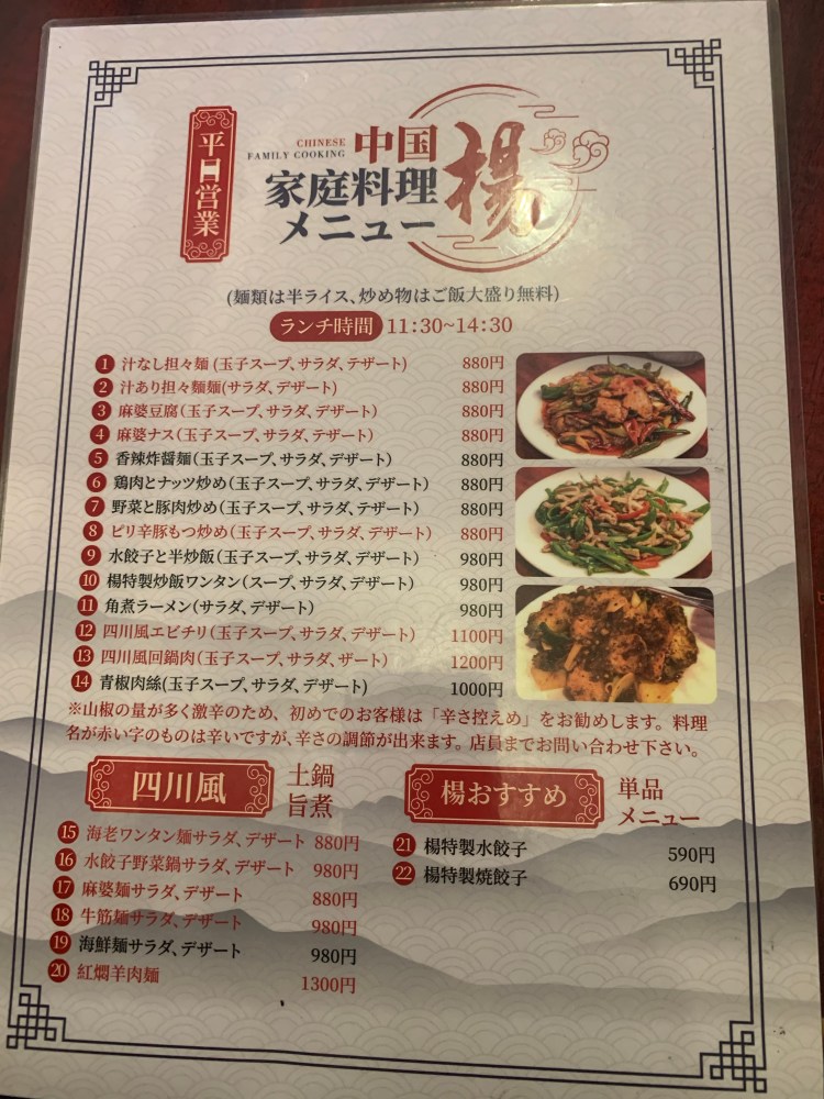 ⚠赤い文字で書かれたメニューは山椒がたくさん入っていて辛さ調整が可能です⚠