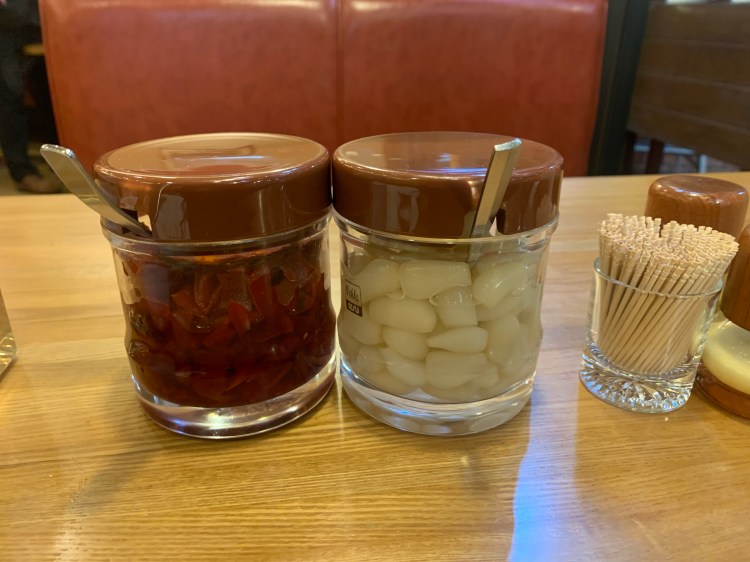 食べススメていくと、辛さが食べるごとに増していくので、卓上にある「らっきょ」に手を出してしまいました!