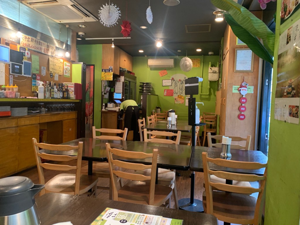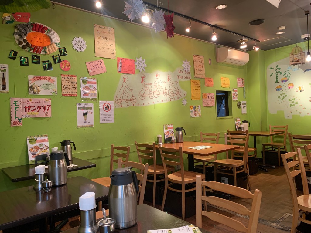黄緑を基調とした壁紙に、木製の温かいインテリアを取り入れた店内は、どこか「ベトナム」を感じさせる内装となっています!