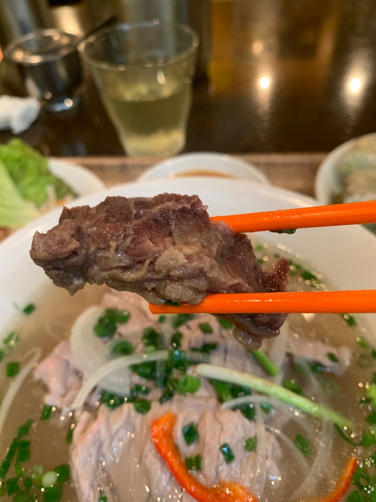 具材は、「牛しゃぶ」「小ねぎ」「玉ねぎ」「パプリカ」「牛テール」と結構種類が入っているのも嬉しいです!しかも「牛テール」が美味しい!コラーゲンたっぷりの「牛テール」の柔らかいことったらないです!麺と一緒に食べれば牛肉のコクがフォーとからまり笑顔になるほど美味しいかったです!